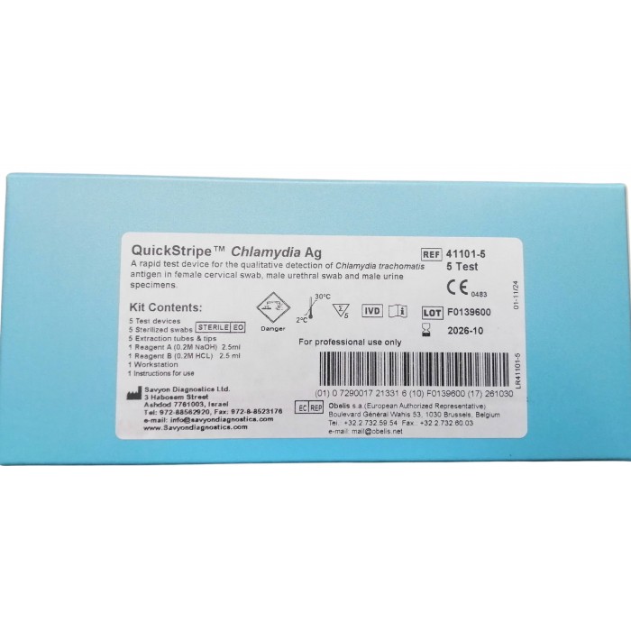 A rapid, simple and reliable test for the detection of chlamydial infection, caused by Chlamydia trachomatis from a cervical swab in women, a urethral swab in men and an eye sample in symptomatic patients. 5 tests in one package.