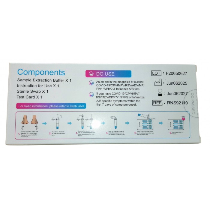 Súprava sa používa na rýchlu detekciu COVID-19, vírusu chrípky A (Flu A), vírusu chrípky B (Flu B), respiračného syncytiálneho vírusu (RSV), adenovírusu (ADV), M. pneumoniae (MP), Chlamydia pneumoniae (CP), ľudského metapneumovírusu (HMPV), antigénu vírusu parainfluenzy 1/3 (PIV1/3) a parainfluenzy (PIV2) v nosovom výtere. Výsledok poznáte za 10 minút.